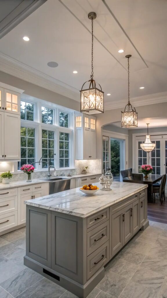Hey, kitchen design lovers! Take a look at this stunning space. It’s the perfect blend of classic elegance and modern functionality. I’m obsessed with the massive marble island. It’s beautiful and a true workhorse. The gray base is chic and contrasts beautifully with the white cabinets.