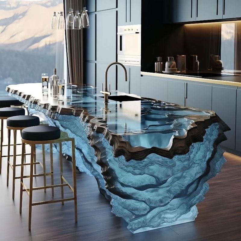 The surrounding kitchen is sleek and minimalist, with flat-panel, dark gray cabinetry and a simple, clean aesthetic. The dark wood floors and subtle gold accents provide warmth, but the entire space is designed to put the incredible island on display. It’s a surreal and luxurious blend of natural inspiration and cutting-edge design.