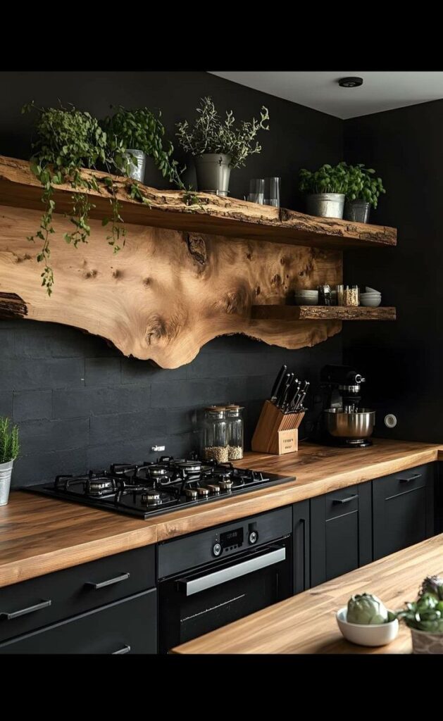 The rich, natural elements come from the stunning live-edge wood countertops and the large floating live-edge shelf above the stove. The organic shapes and warm tones of these wooden features create a beautiful and dramatic contrast against the dark surfaces. Simple black hardware and a sleek stovetop complete the minimalist aesthetic. Potted plants on the shelves add a touch of life, making the space feel sophisticated yet inviting.