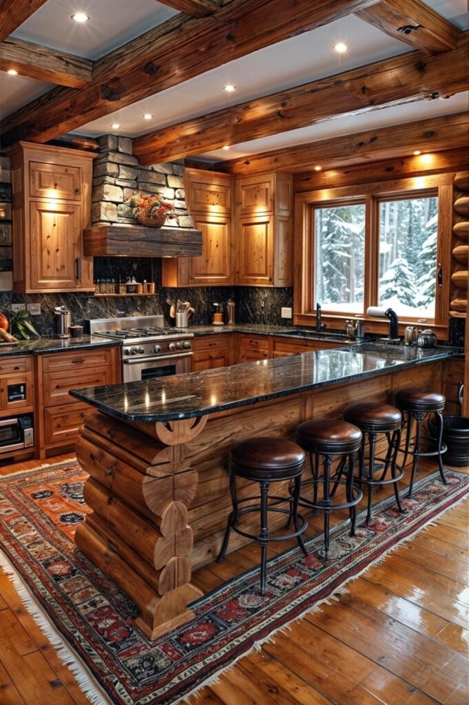 This classic log cabin kitchen exudes warmth and rustic charm. Every element of the space celebrates natural wood, from the log-style island and ceiling beams to the custom cabinetry and polished wood floors. The large island features a black granite countertop and a unique log base, providing a functional workspace and a cozy breakfast bar complete with leather-topped stools.