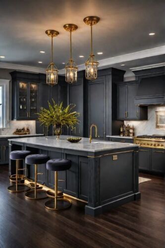 This luxurious and dramatic kitchen makes a bold statement with its sophisticated, dark color palette and polished metallic accents. The cabinetry and central island boast a deep matte charcoal or black finish, exuding elegance and modernity. The island is a commanding focal point with a beautiful white marble countertop that provides a striking contrast. It also features subtle gold trim and a built-in light strip along the bottom that adds a warm, ambient glow.