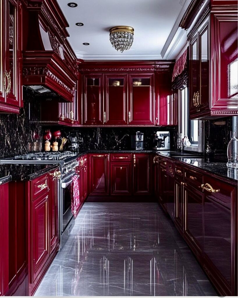 The countertops and backsplash are made of dark, polished marble or granite with striking gold or white veining. This provides a sophisticated contrast to the intense red cabinetry. A large-format gray marble tile covers the floor, reflecting light from the ceiling and contributing to the overall feeling of spaciousness and elegance. A small yet elegant chandelier with crystal accents hangs from the ceiling, serving as a focal point that enhances the glamorous atmosphere. This kitchen makes a powerful statement about style and luxury, and is perfect for someone who isn’t afraid of color or classic extravagance.