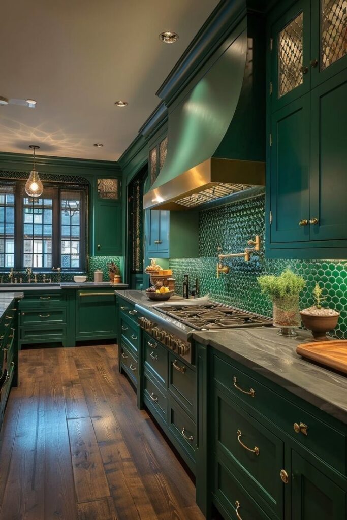 The rich, forest green cabinetry creates a moody yet elegant atmosphere. A standout feature is the distinctive backsplash composed of iridescent green hexagonal tiles that catch the light and impart a lovely texture. The professional-grade stove is topped by a magnificent, custom-designed hood with a green body and contrasting brass or gold trim. This trim is echoed in the cabinet hardware and matching pot-filler faucet. Dark, veined countertops and warm wooden floors balance the rich green tones.
