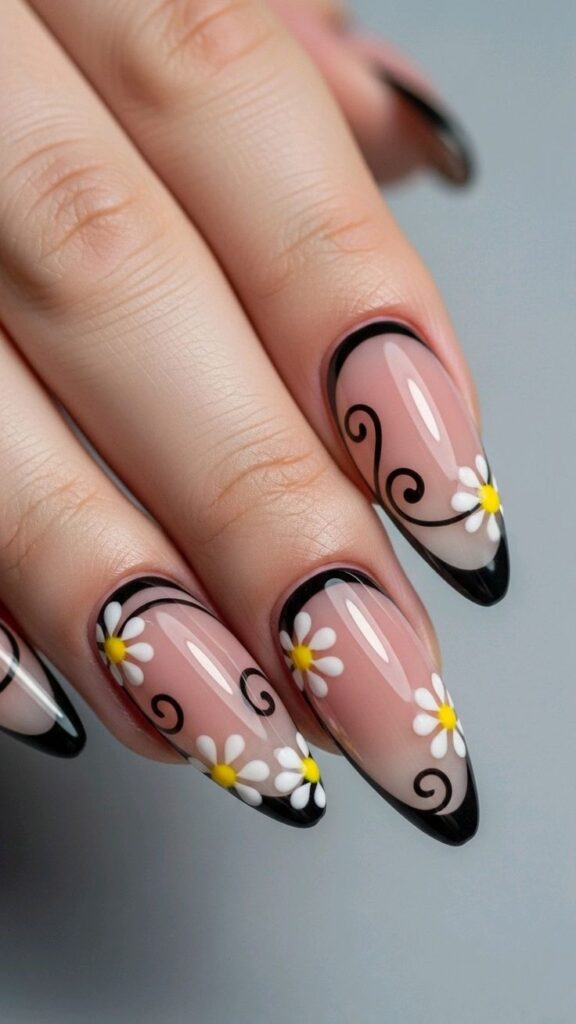 Black and White Daisy Chic: This design is a bit different from the usual French manicure, with black tips and elegant curved patterns for a modern look. Daisy figures scattered across the nails give it a cheerful, retro feel.