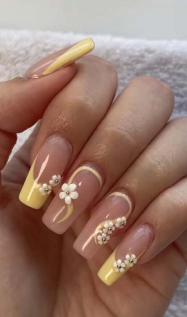 The Harmony of Yellow and White: The dance of yellow and white colors comes to life in this design. The asymmetrical yellow patterns at the tips of the nails give way to delicate white flowers. This soft and minimalist design elegantly reflects the energy of summer.