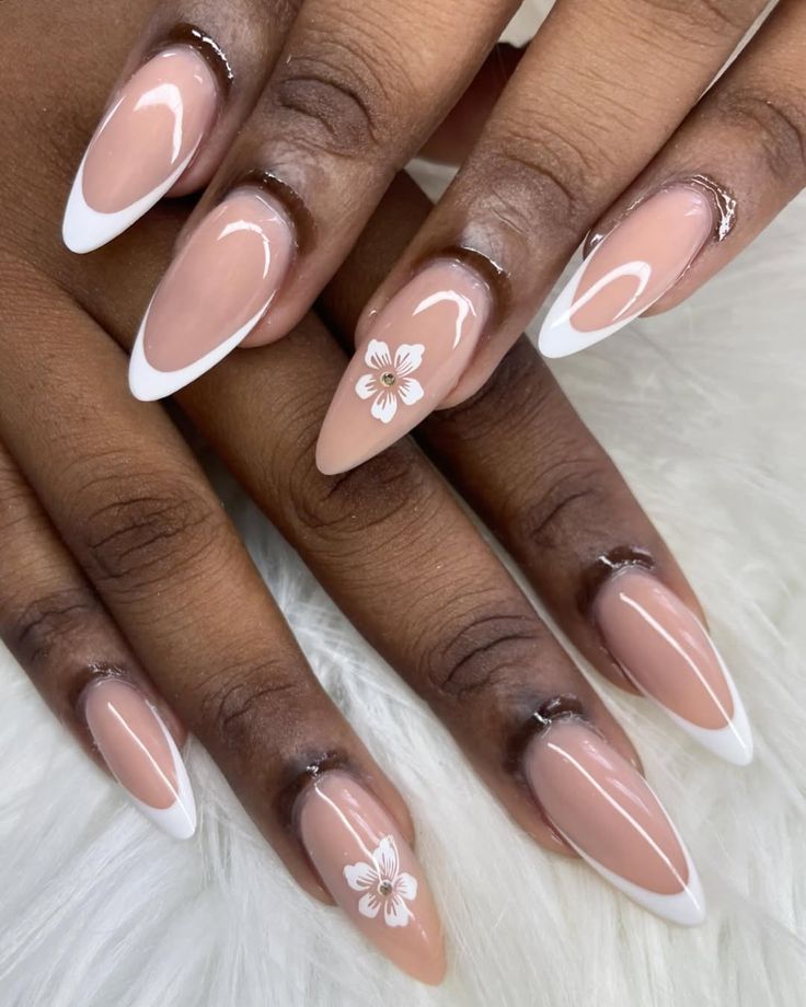 Elegant Floral Touches: This model is pretty romantic, with its classic nude base and white tips and elegant floral details. And when you pair it with almond-shaped long nails, you’ve got a look that’s both natural and stylish.
