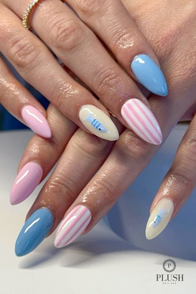 Fun Sea-Themed Design: This model, which mixes pastel pink and blue stripes, captures the spirit of a summer getaway. The cute fish on the white background really adds a cheerful touch to the design.