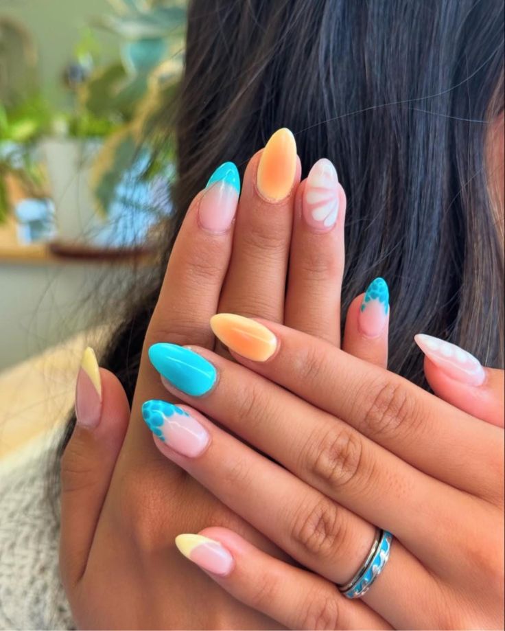 Live Neon and Flowers: This design, which mixes orange and turquoise, is perfect for a fun, festive look. Bring the energy of summer to your fingertips with flower figures and color transitions.
