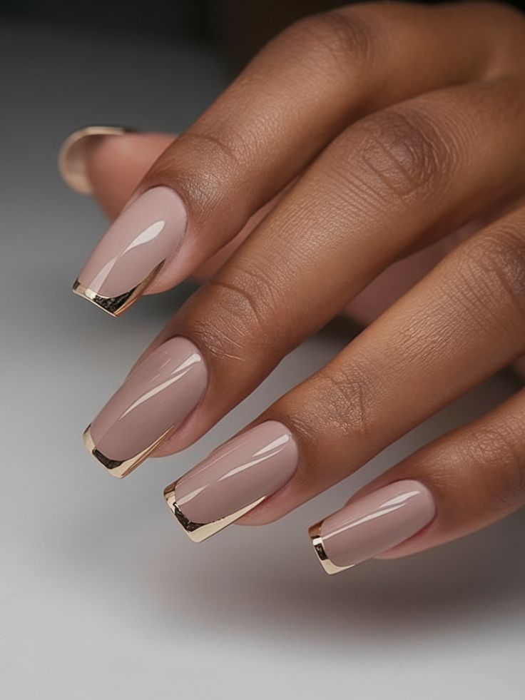 Minimalist Gold Lines: Metallic gold lines on the tips of the nails go well with beige nail polish to create a sophisticated and minimalist style. This design is perfect for any event, from special occasions to everyday wear.