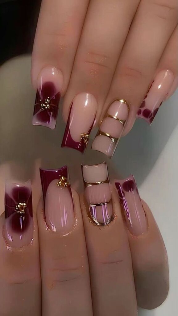 We’ve got some artistic and bold designs for you. The combination of rich burgundy colors and see-through nails creates a design reminiscent of a work of art. It’s got gold beads and lines, so it’s perfect for anyone who wants something bold and unique.