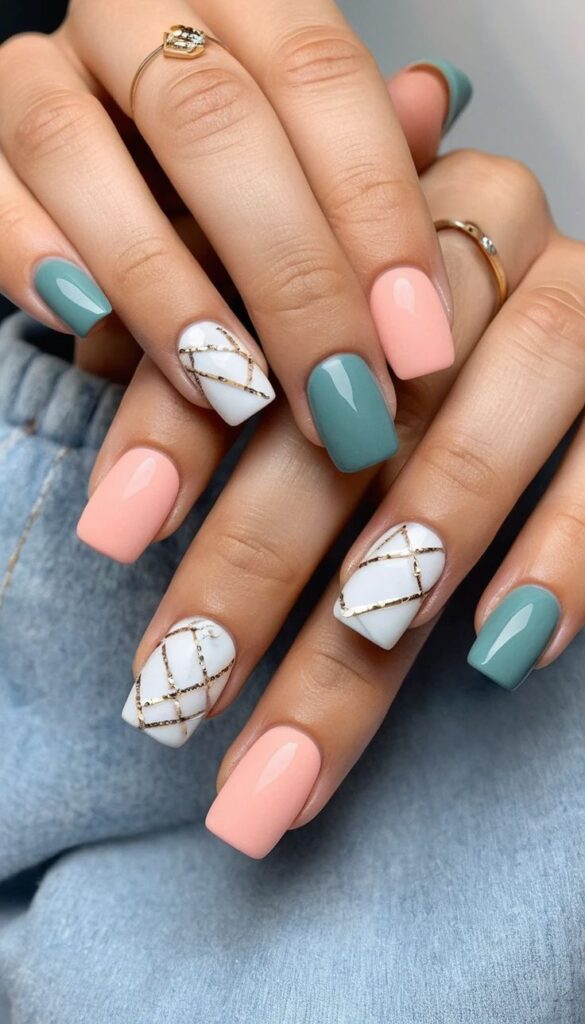 Geometric Lines and Pastel Tones: This design, which uses matte pastel peach and sea blue nail polishes, is complemented by gold-colored geometric lines. The mix of different colors and patterns will give your nails a dynamic touch.