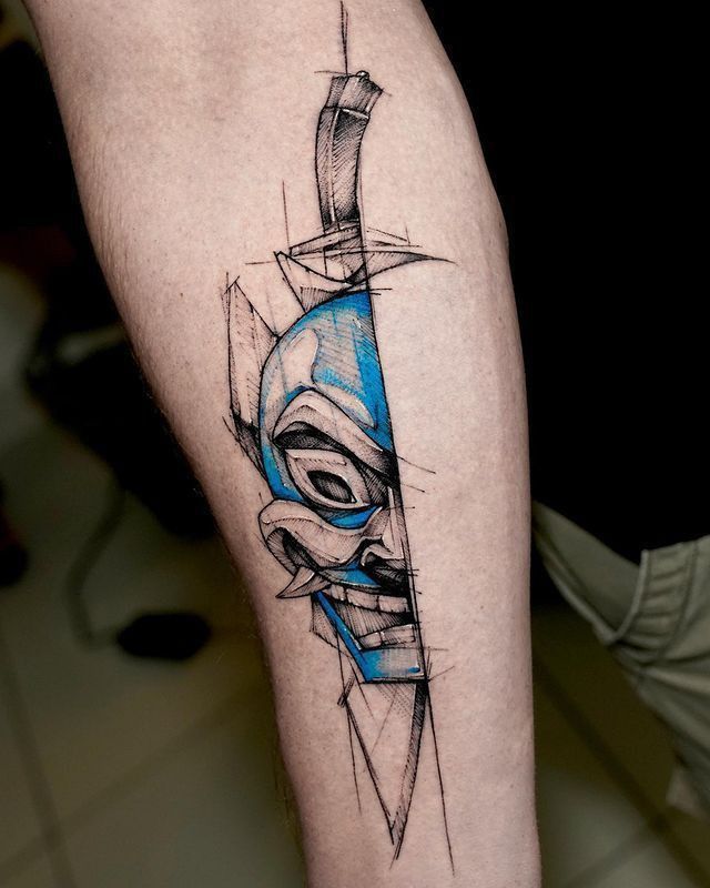 This tattoo features the Hannya mask from Japanese mythology in a modern, abstract design with dynamic, sharp lines. The addition of a blue color detail and a sword to the classic figure gives the design a modern energy. This mask, which represents anger and jealousy, has been reinterpreted in a different art style.