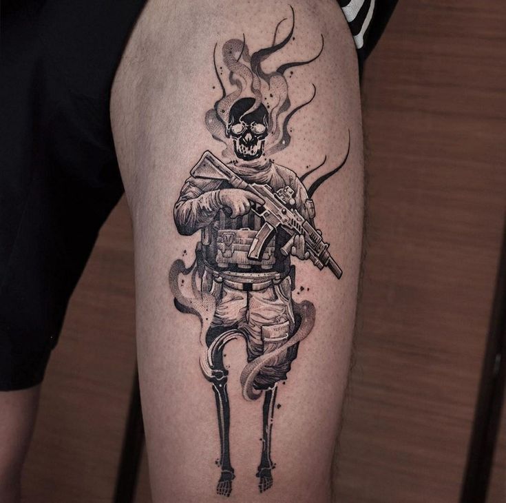This tattoo reflects the lasting scars of war by combining the image of a soldier with a skeleton and smoke. The skeleton, adorned with weapons and military gear, represents the destructive and deadly nature of war. The black-and-white colors and smoke effects intensify the tattoo’s dramatic atmosphere.
