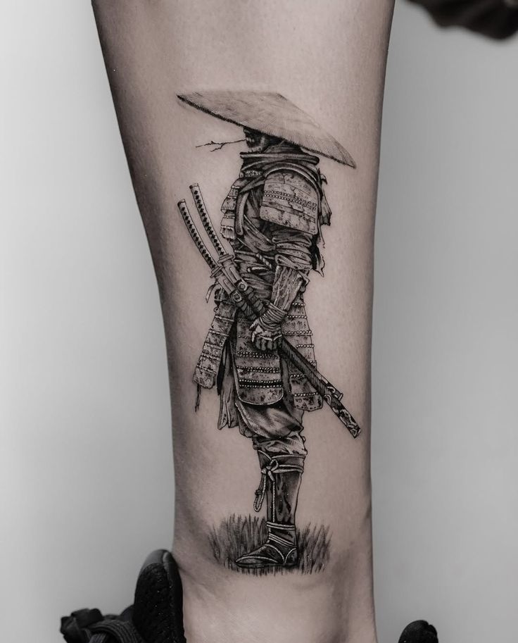 The image depicts a samurai warrior in extraordinary detail. The shadows in his armor add depth to the design, and his posture reflects honor and strength. The black-and-white style makes the tattoo a classic, timeless work of art.