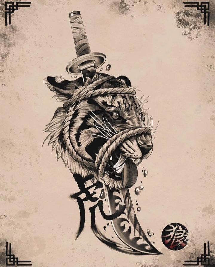 25) Tiger and Japanese Sword: Tattoo of Strength and Courage