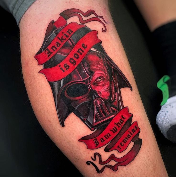 It symbolizes one of the most tragic moments in the Star Wars universe. The visible single eye beneath Darth Vader’s helmet reveals that Anakin Skywalker is still inside. Meanwhile, the famous quote on the red banner, “Anakin is gone; what remains is me,” powerfully conveys the character’s identity transformation. The tattoo is visually and semantically impressive.