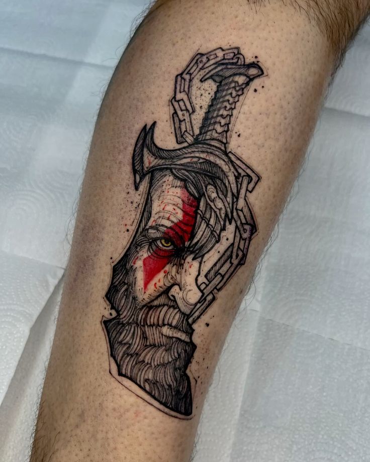 This tattoo reinterprets the legendary character Kratos from the God of War series in a unique artistic style. The iconic red tattoo on his face and the chain details reflect his wild and painful past. A linear and geometric approach transforms the tattoo into a modern, minimalist masterpiece.