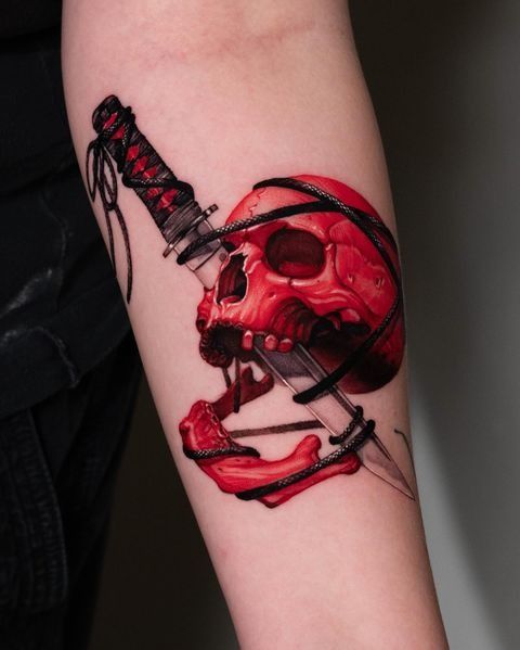 The tattoo depicts a red skull pierced by a dagger. The black rope details give the tattoo a mysterious, ritualistic feel. With its vivid colors and symbolic meaning, this tattoo is a bold choice.