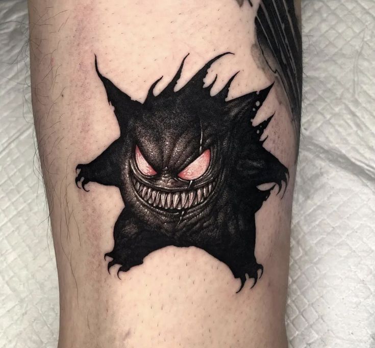 This tattoo features a more frightening and realistic interpretation of the popular Pokémon character Gengar. Its dark black tones, red eyes, and sharp teeth emphasize its ghostly and terrifying nature. This unique tattoo brings a modern touch to a classic figure.