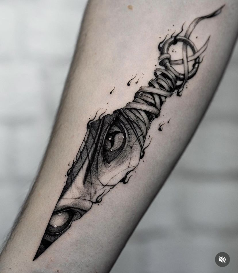It depicts a terrifying eye inside a bandaged knife. The black-and-white tones and detailed drawings reinforce the tattoo’s mysterious and dark atmosphere. It is a unique choice for fans of fantasy and gothic themes.