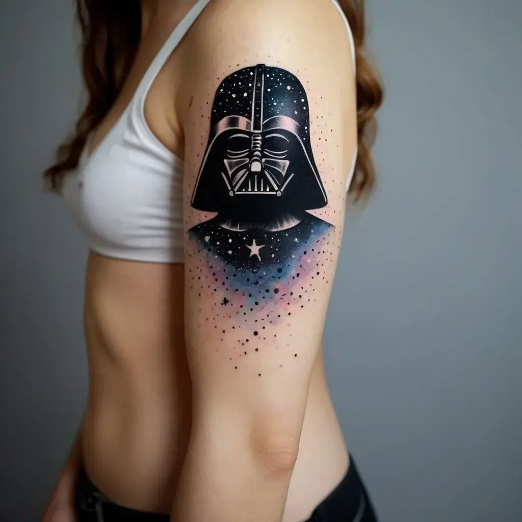 It features Darth Vader, the most famous character in Star Wars, against a galaxy backdrop. Vader’s helmet is featured against a colorful nebula and starry background. The design blends the character’s dark, dominant image with the beauty of the universe. It’s a striking and unique tattoo for fans of movies and galaxy-themed tattoos.