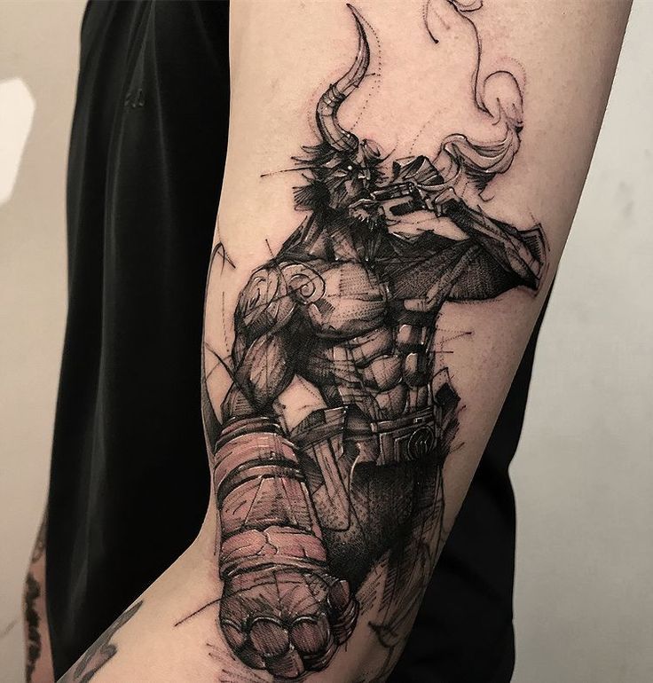 This highly creative tattoo depicts the legendary action film character John Wick with a design reminiscent of the multi-armed Hindu gods. The figure holds a weapon in each arm, emphasizing the character’s unstoppable, versatile warrior image. The black-and-white drawing enhances the tattoo’s artistic and mythological aesthetic.
