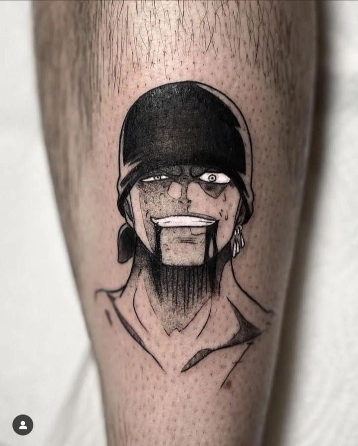 It depicts Roronoa Zoro from the anime One Piece with a serious expression. The black-and-white coloring and scanning technique enhance the tattoo’s comic book aesthetic. Zoro’s determined and stern stance makes the tattoo quite impressive. This piece reflects the character’s strong personality and is ideal for One Piece fans.