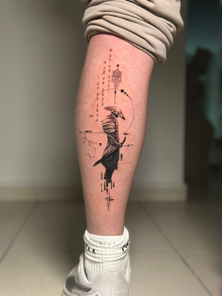 It looks like an abstract work of art. A hand gripping a sword is combined with geometric and minimalist details. Numbers, symbols, and constellation patterns reflecting astrology and cosmic themes add a personal, mysterious narrative to the tattoo. Black-and-white tones emphasize the tattoo’s elegant, modern look.