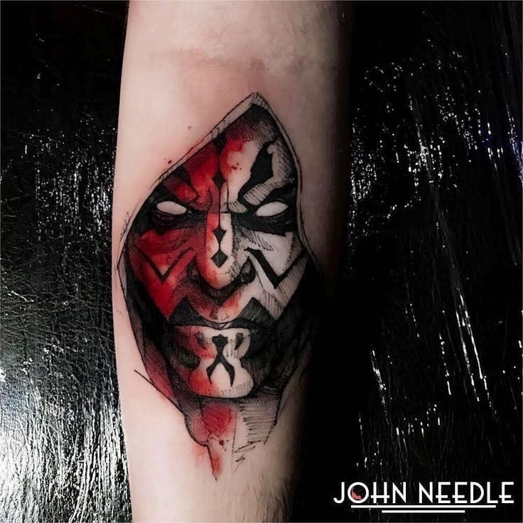 This tattoo depicts Darth Maul, an iconic Star Wars character, using water and brushstroke effects. The red and black colors contrast to emphasize the character’s dangerous and rebellious nature, and artistic touches give the tattoo a modern feel. The sharp lines and shadows on his face add depth, highlighting his powerful stance. This tattoo is an excellent choice for Star Wars fans and anyone seeking a dramatic, artistic design.
