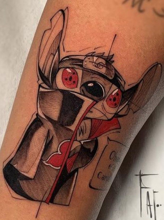 In a humorous blend of popular culture, it combines the adorable Stitch from Lilo & Stitch with the dangerous Akatsuki organization from the anime Naruto. Stitch’s Akatsuki cloak and Sharingan eyes blend the cute character with the dangerous figure in a comical way. This tattoo is a creative and fun choice for anime and cartoon fans.
