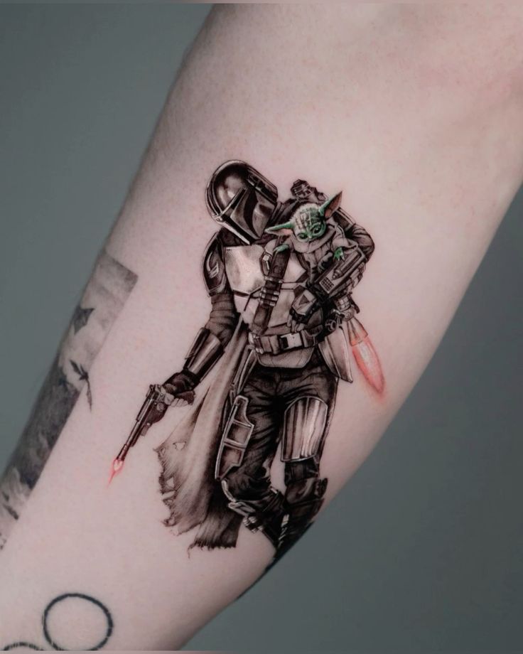 It elegantly brings together Mando from the popular Star Wars series The Mandalorian and Grogu, also known as “Baby Yoda.” The black-and-white illustration emphasizes the characters’ seriousness, and Grogu’s green and red lightsaber adds vibrancy to the tattoo. The lighting and shading, in particular, give the tattoo depth.