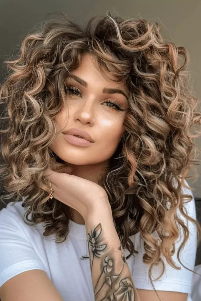 This is a great way to add a modern touch to natural curls. Shimmering highlights in different tones make the hair look thicker.