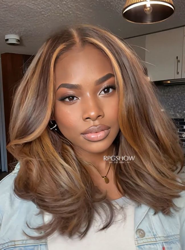 This long, wavy hairstyle highlights the face with honey and caramel highlights. These warm colors make the hair look thicker and more modern.