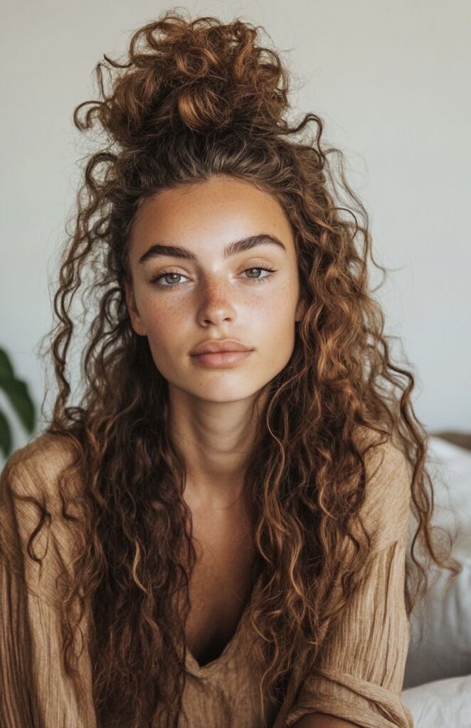 This style, which combines long, natural curls with a messy bun, looks very stylish and is the definition of effortless chic. It’s both practical and stylish for everyday use.