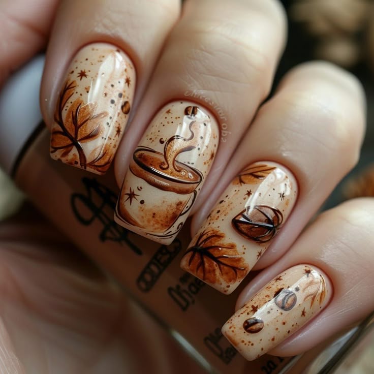 10) Coffee and Leaf-Themed Manicure: Autumn Romance Nail Art