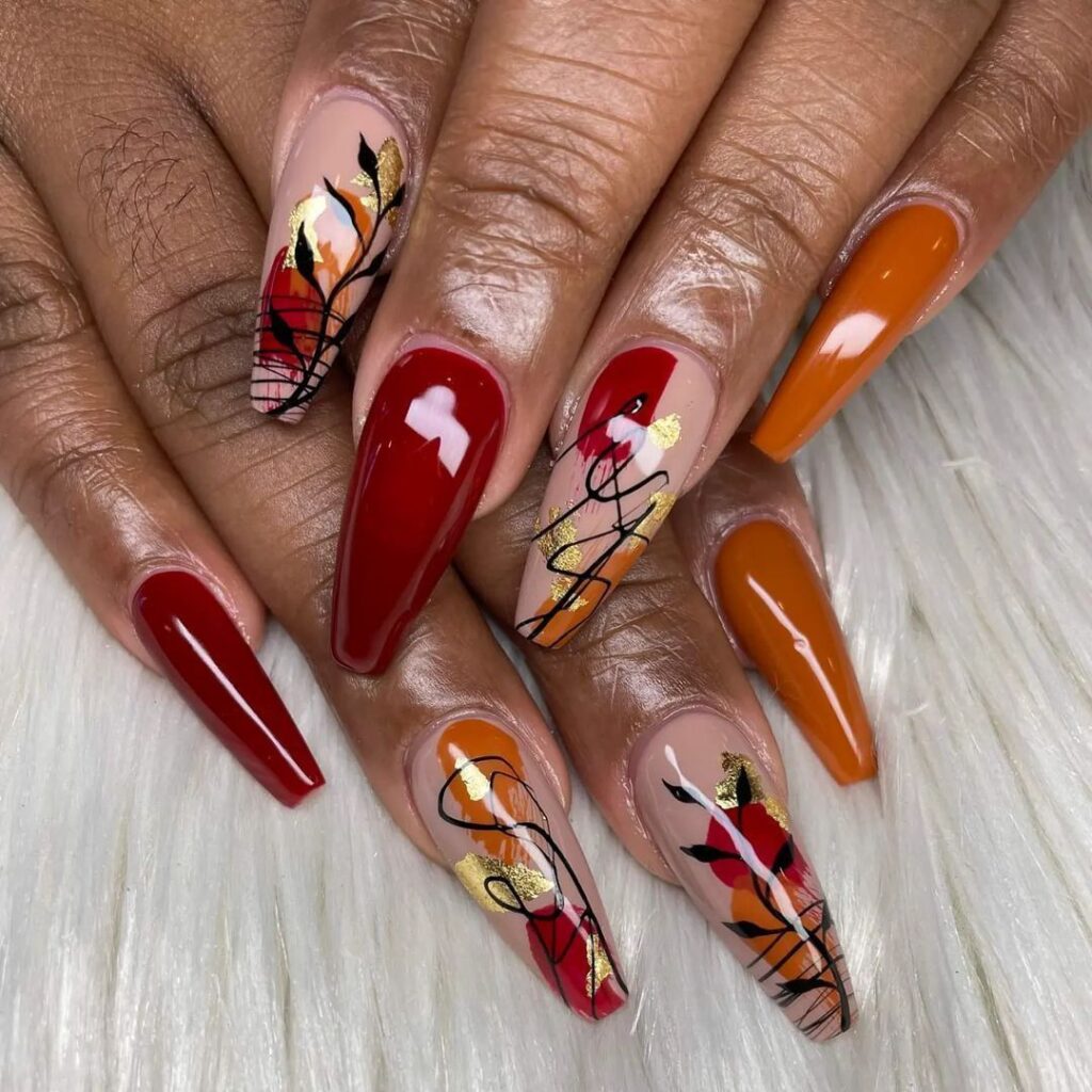 This manicure is a modern and artistic take on classic fall colors that will make you feel ready to embrace the season. Red, orange, and nude tones come together with abstract brushstrokes and black lines to make each nail a one-of-a-kind work of art. And just look at those gold foil details! They add a luxurious and shiny touch to the design. If you’re someone who loves creative and different styles, this is a great choice for you!
