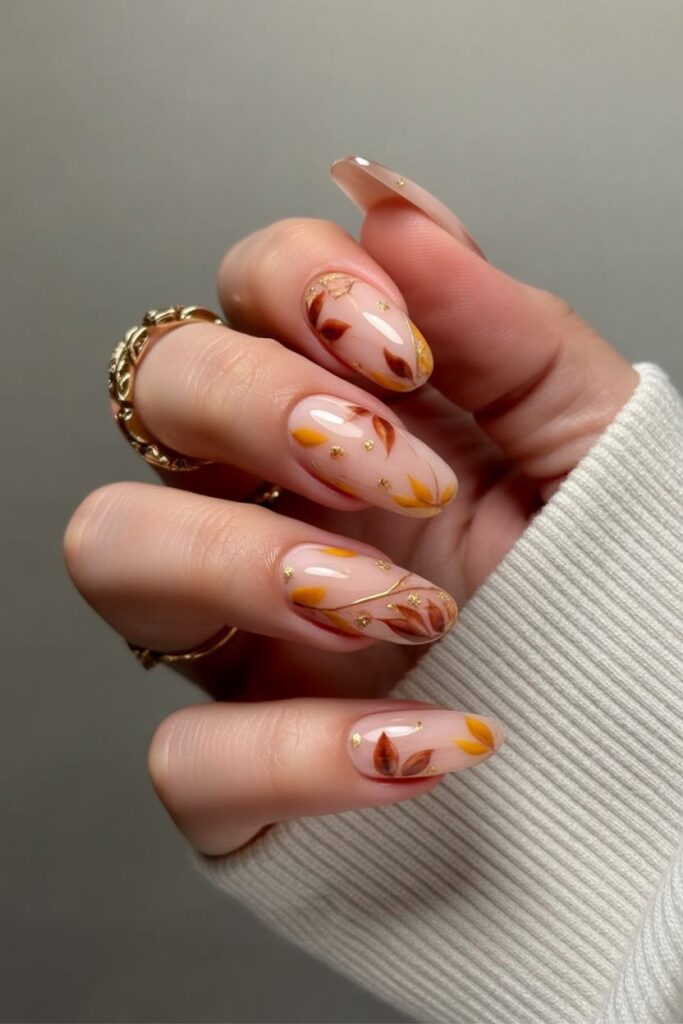 The transparent nude polish applied to long, almond-shaped nails gives the nails a natural and clean look. The beautiful brown and orange leaf patterns, embellished with gold leaf and delicate fine lines, add a touch of elegance to the design. If you’re someone who wants to avoid exaggeration but still craves elegance, then this model is absolutely perfect for you!