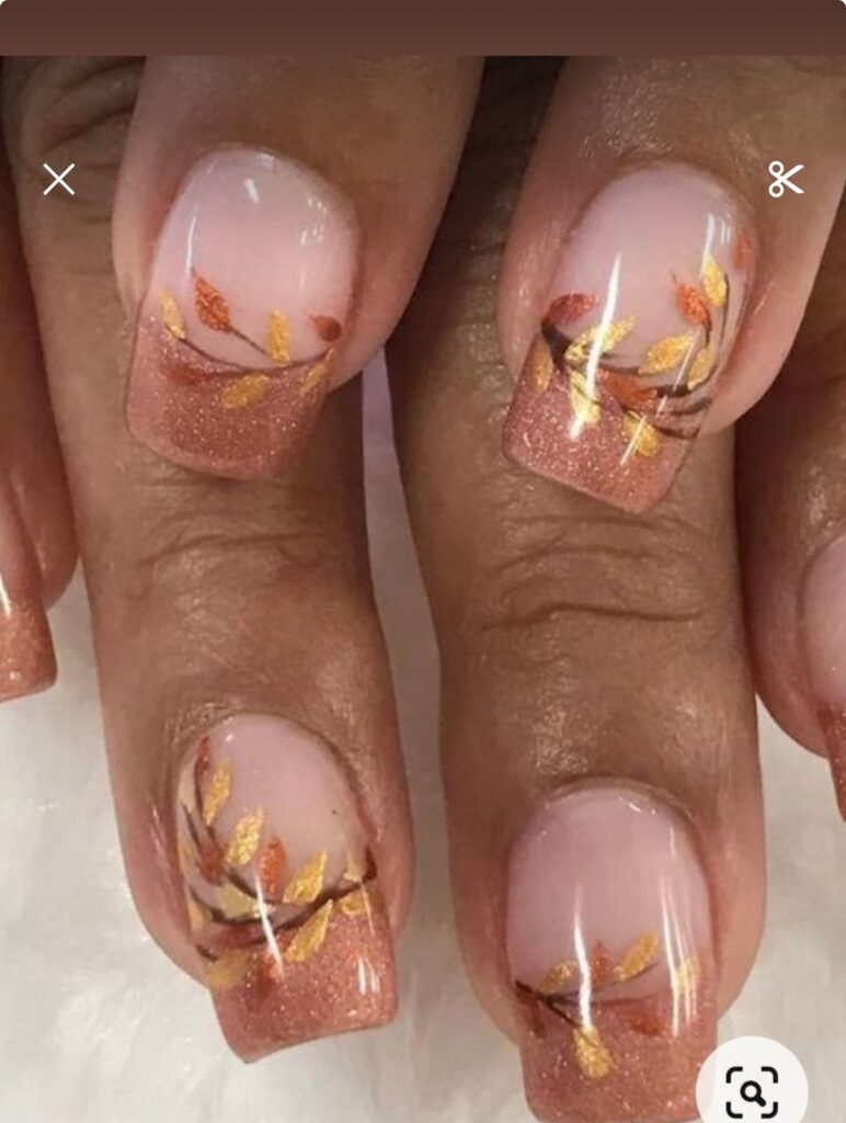 The shimmering bronze glitter French manicure at the tips of the nails offers a simple and elegant look. The beautiful leaf patterns surrounding these shimmering tips add the spirit of autumn to the design. This classic piece is perfect for any occasion, whether you’re going out on the town or just enjoying a relaxed day at home.