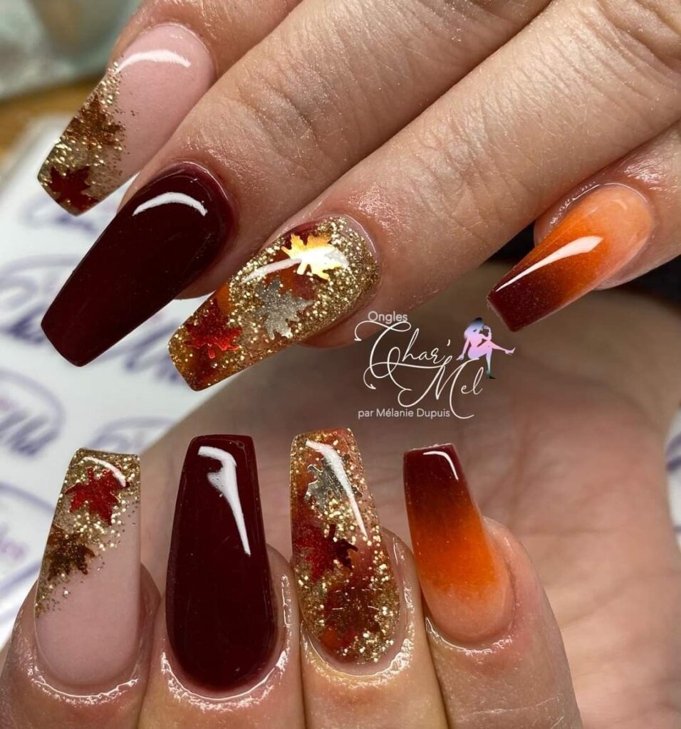 The burgundy and orange ombre transitions, combined with glitter details and gold-colored leaves, are absolutely stunning. And the different designs on each nail? They’re like a party for the eyes! If you’re looking for a chic and cheerful look, you’ve found the perfect choice!