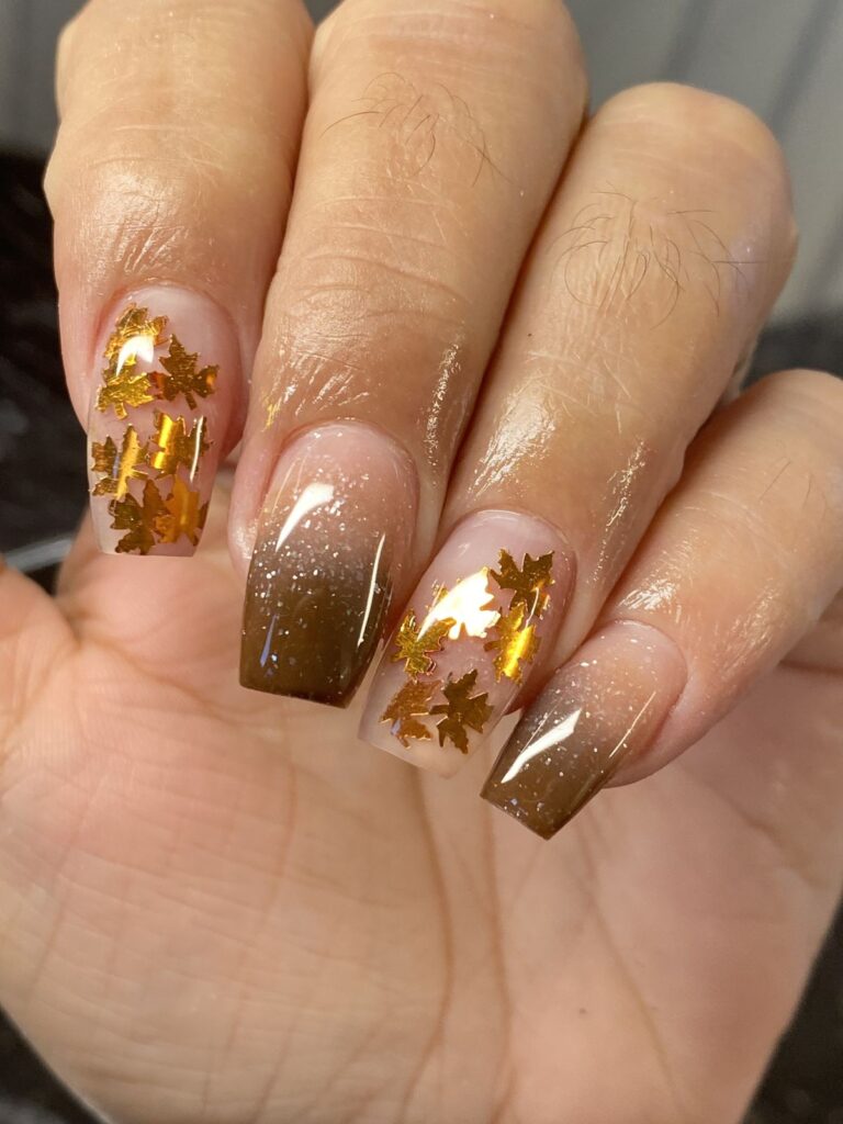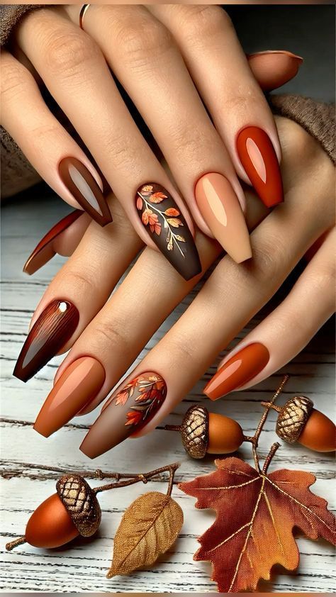 This bold manicure combines warm autumn colors to give long, square nails a modern and sophisticated touch. The way the colors blend together is absolutely stunning, with a mix of glossy brown, matte taupe, and nude tones that make each finger look absolutely unique. The leaf patterns and gold details on the middle nail make the design feel like a work of art. If you’re someone who loves to make a statement, this style is perfect for you!