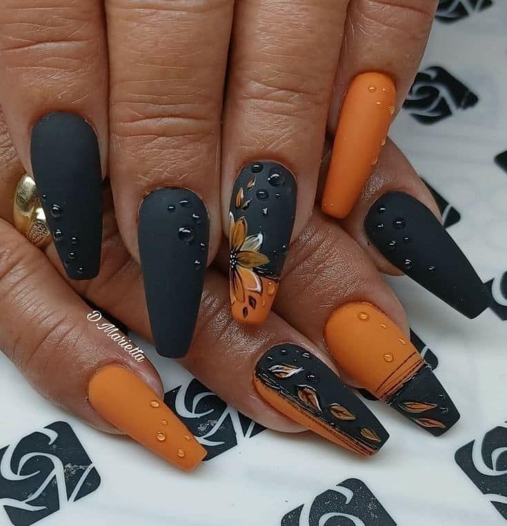 2) Matte Black and Orange Nails: Two Faces of Fall Together