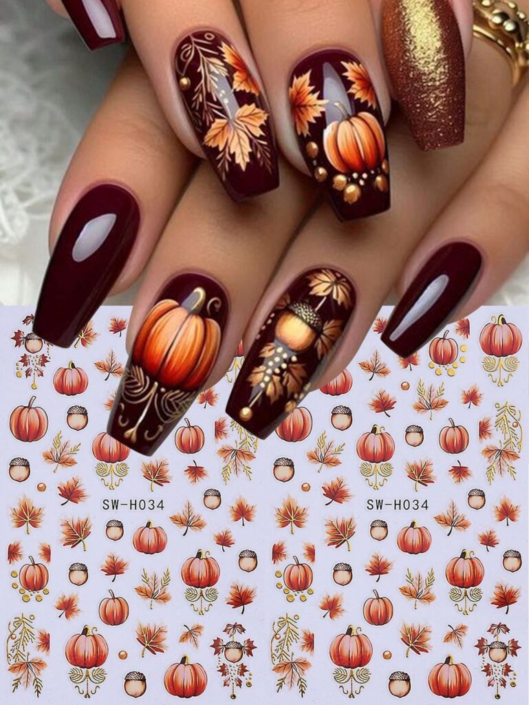This manicure is like a warm hug in a bottle, bringing together the most beloved symbols of autumn to create a cheerful atmosphere. The beautiful pumpkin, leaf, and acorn designs in gold and orange colors really pop against the bright burgundy base. When you use different patterns together, it makes each nail truly unique. It’s the perfect source of inspiration for autumn celebrations and Halloween.