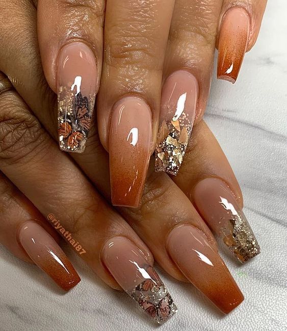 4) Ombre and Glitter Detailed Fall Manicure: Special for Shiny and Long Nails