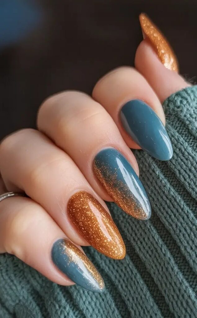 If you’re looking for something a little different from the usual autumn shades, this manicure is the perfect choice. The combination of teal blue (like the sea) and bright bronze is absolutely stunning on the nails. The soft ombre transition from blue to bronze, especially with the shimmering bronze shade, adds a touch of drama to the design. If you’re someone who’s into bold colors, this is absolutely the perfect choice for you!