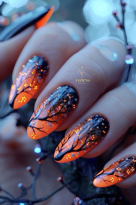 The bright orange and black tones are a perfect reflection of the spirit of Halloween, and the glittering details and stylized tree motifs really make it pop. The way the branches of the tree gracefully reach for the sky at the tips of the nails, and the sparkling dots that adorn them, infuses the design with a touch of enchantment. It’s the perfect choice for Halloween parties and special events.