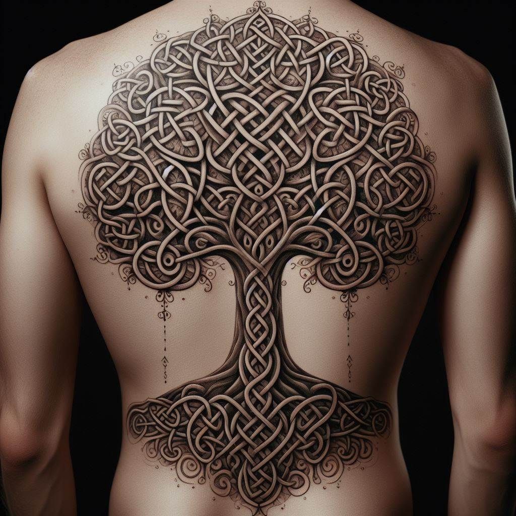 This tattoo, which covers the entire back, reimagines the traditional Celtic Tree of Life symbol in a contemporary style. The intricate structure formed by intertwining knots symbolizes the endless cycles of life and the universe and the complex relationships that bind families together. It is a bold and impressive tattoo.