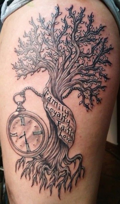The words “family, loyalty, faith, love” hold personal significance. The pocket watch next to the tree emphasizes that these values are timeless. It’s a meaningful and timeless choice.