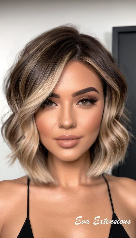 It shows how striking a color contrast can be on short hair. The haircut is a modern lob at shoulder length. The ends are thick and full. The color is a dark brown base, especially at the roots, combined with eye-catching platinum and ash blonde balayage highlights. The intensity of the blonde color in the front strands that frame the face adds an instant luxurious and bold feel to this style. The thickness of the balayage and the sharp color transition offer a modern take on the popular “money piece” trend. The hair is parted on the side and styled with soft, defined waves. These waves accentuate the color transitions even more. The makeup features thick eyeliner, smoky eyes, and nude lips for a bold look.