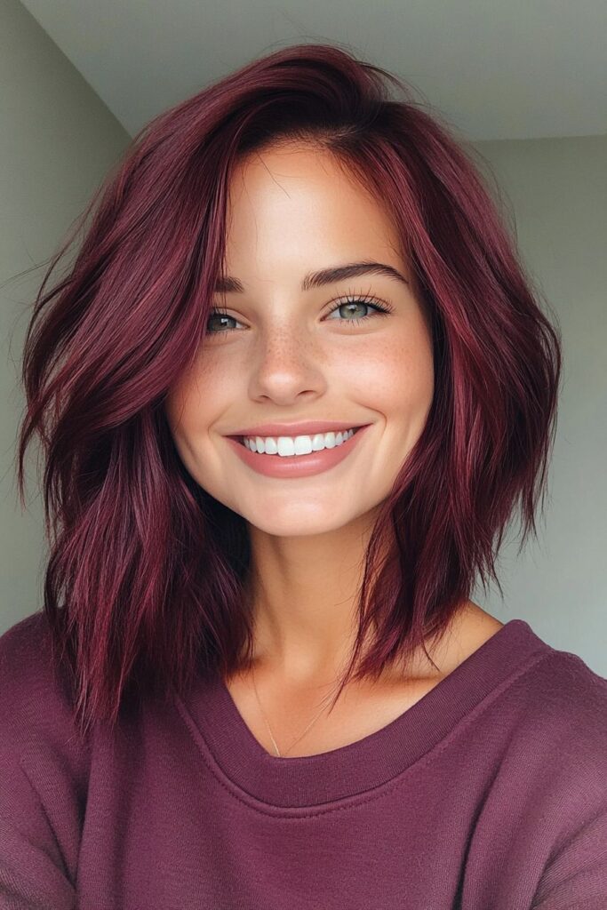 t definitely draws all the attention. The entire hair is dyed in a bright and rich reddish-purple tone, or burgundy as it is popularly known. This vibrant color creates a wonderful contrast with the model’s fair skin and green eyes. The cut is a short-medium length lob (bob) style with a slightly layered structure that adds movement. The ends are slightly curled outward and given a messy volume for an effortlessly chic look. The side part beautifully frames the face. The makeup features accentuated natural freckles and a simple complexion. This vibrant hair color is a perfect choice for those who want to make a statement without going overboard.
