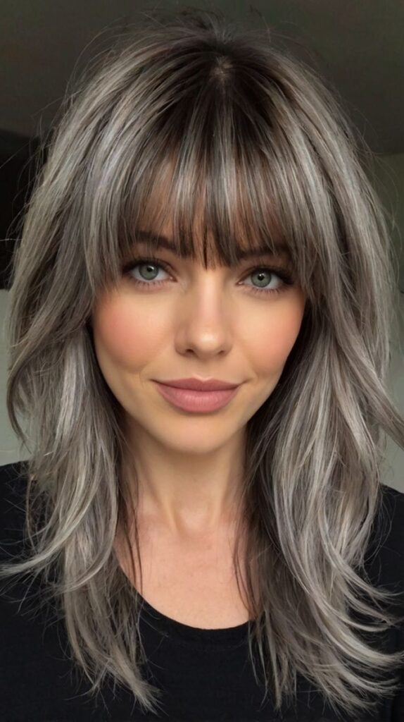 It offers a modern take on the “granny hair” trend. The model’s hair is a color that starts with dark roots and transitions into dense ash gray and silver tones throughout. This contrast adds depth. The medium-length cut has a layered structure. The most striking detail is the combination of straight, full bangs and soft, side-swept bangs. This fringe style highlights the eyes and adds a soft, feminine touch to the overall look. The hair is styled with a voluminous blowout. The makeup features peach-toned blush and nude-pink lips, which create a warm balance with the cool hair color.